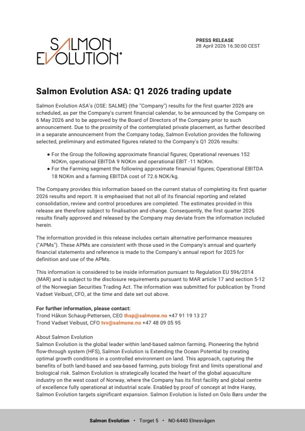 Salmon Evolution ASA’s (OSE: SALME) (the “Company”) results for the first quarter 2026 are scheduled, as per the Company’s current financial calendar, to be announced by the Company on 6 May 2026 and to be approved by the Board of Directors of the Company prior to such announcement. Due to the proximity of the contemplated private placement, as further described in a separate announcement from the Company today, Salmon Evolution provides the following selected, preliminary and estimated figures related to the Company’s Q1 2026 results: