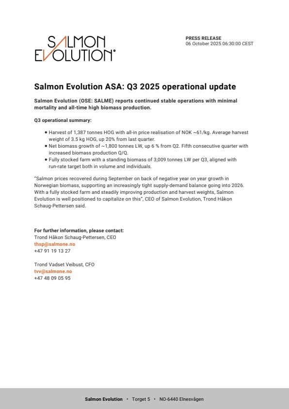 “Salmon prices recovered during September on back of negative year on year growth in Norwegian biomass, supporting an increasingly tight supply-demand balance going into 2026. With a fully stocked farm and steadily improving production and harvest weights, Salmon Evolution is well positioned to capitalize on this”, CEO of Salmon Evolution, Trond Håkon Schaug-Pettersen said.